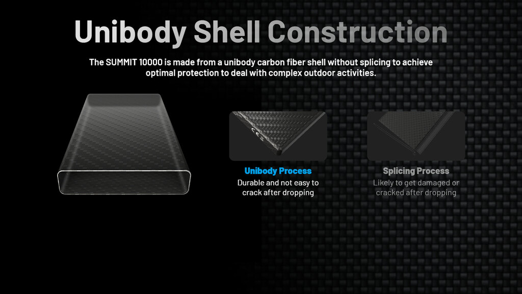 Carcasa dintr-o singură bucată de fibră de carbon garantează rezistență, greutate redusă și rezistență la șocuri și apă. Bateria externă poate rezista la căderi de la înălțime, ploaie și zăpadă. Un însoțitor ideal pentru expediții unde nu este loc pentru echipamente fragile.
