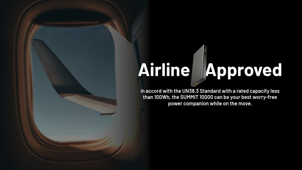 Summit 10000 îndeplinește standardele internaționale pentru transportul aerian sigur, astfel că poate fi luată fără probleme în cabină. Circuitele de protecție previn supraîncălzirea, scurtcircuitul și supratensiunea – energia rămâne sub control în orice situație.