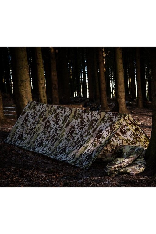 Această prelată versatilă este în culoare verde discretă, așa că este cu adevărat ascunsă în teren. În plus, sunt incluse patru corzi extensibile (cunoscută ca guy-lines). Puteți să agățați prelata între copaci, dar folosind echipament obișnuit, precum bețele de trekking, o puteți folosi și ca un adăpost independent. De asemenea, poate fi transformată în tărgi de urgență.