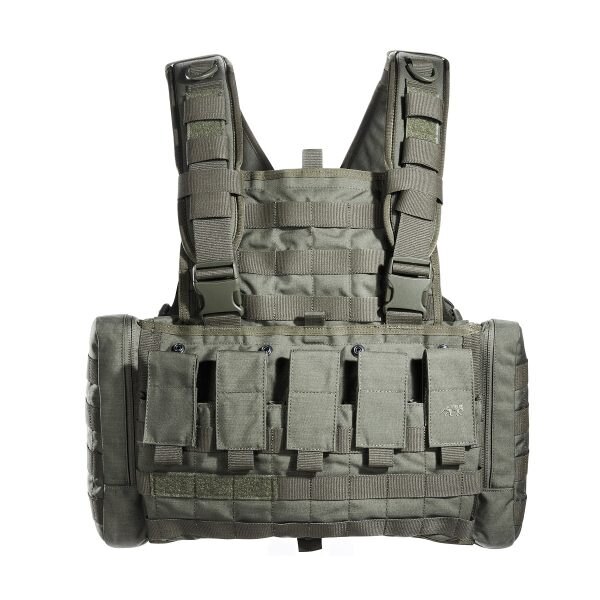 Pe partea din față sunt plasate cinci pungi cu închidere cu velcro și curea pentru deschidere ușoară chiar și cu mănuși. În ele se poate depozita suficientă forță de foc sub formă de încărcătoare pentru M4, AR-15 sau STG. Sub aceste pungi se află un buzunar spațios, potrivit pentru depozitarea hărților și a altor documente. Pe laterale sunt două buzunare multifuncționale cu fermoar suficient de mari pentru o sticlă de apă de 1 l, kit de prim ajutor, sau alte echipamente. În plus, sistemul MOLLE compatibil pe lateral, abdomen și bretele permite atașarea altor echipamente. În partea din dreapta față este un patch cu velcro pentru plasarea unei etichete de identificare. Datorită materialului folosit, hamul este rezistent la deteriorare și potrivit pentru utilizare chiar și în condiții dificile. Forțele armate vor aprecia buzunarul din zona toracică în care poate fi inserat un panou balistic de dimensiuni maxime 30 cm x 30 cm. În plus, elementele de fixare, cataramele și bretelele, precum și toate țesăturile sunt tratate cu un finisaj IRR care reduce reflexia în spectrul infraroșu. Acest lucru îndeplinește standardele înalte ale Bundeswehr-ului german TL 8305-0278 și TL 8305-0281 pentru efectul de camuflaj IRR (IRR 650 nm – 1250 nm / 10 – 42 %).