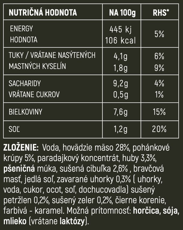 | Specificații suplimentare | Ambalaj practic cu termen de valabilitate lung. Procesare modernă - gust natural, păstrează vitaminele Sățios și gustos 100 % masă și ingrediente naturale selectate Preparare instantanee - tehnologie autoîncălzitoare Campcore® - fără foc, fără aragaz, fără vase Pregătirea mâncării: rupeți sigiliul ambalajului, deschideți capacul superior și scoateți acul, trăgând de inel deschideți capacul interior, în locurile marcate de pe marginea cutiei împingeți acele în jos până la baza deschiderii, amestecați regulat, după 6 minute mâncarea va fi încălzită la o temperatură de 60 °C până la 70 °C și va fi pregătită, așteptați puțin și amestecați - fiți atenți, din deschideri poate ieși abur fierbinte Sure, please provide the text you'd like me to translate from Czech to Romanian. Compoziție: Apă, carne de vită (28%), crupe de hrișcă (5%), concentrat de roșii, ciuperci (3,3%), făină de grâu, ceapă uscată (2,6%), untură de porc, sare comestibilă, castraveți murați (0,3%; castraveți, apă, zahăr, oțet, sare, condimente), pătrunjel uscat (0,2%), țelină uscată (0,2%), piper, coloranți - caramel |