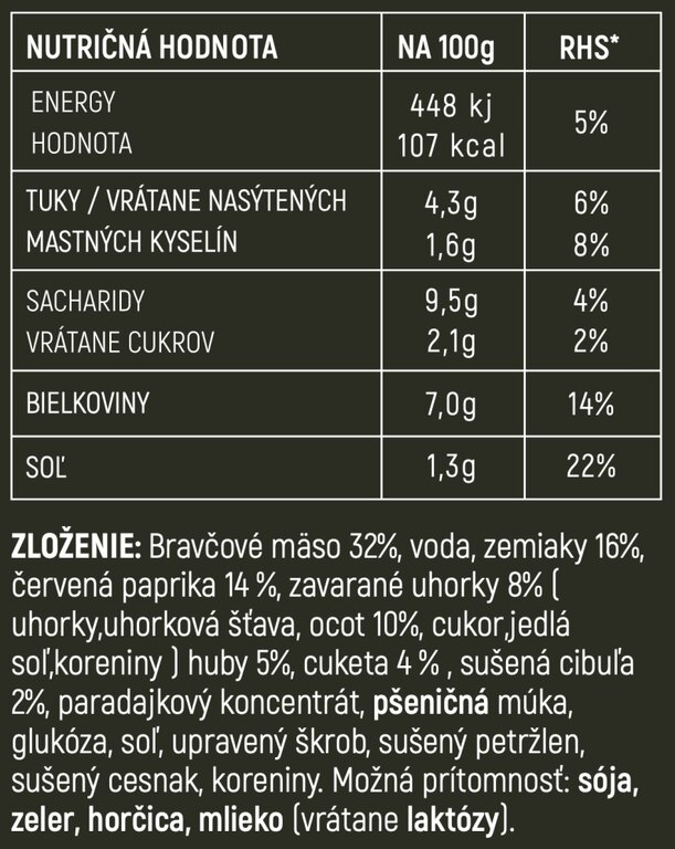 | Specificații suplimentare | Ambalaj practic cu durată lungă de valabilitate Prelucrare modernă - gust natural, păstrează vitaminele Sățios și gustos 100 % masă și ingrediente naturale selectate Pregătire instantanee - tehnologie autoîncălzitoare Campcore® - fără foc, fără aragaz, fără vase Pregătirea mâncării: rupeți sigiliul ambalajului, deschideți capacul superior și scoateți acul, trăgând de inel deschideți capacul interior, în locurile marcate de pe circumferința cutiei împingeți acul în jos până la fundul orificiului, amestecați regulat, după 6 minute mâncarea va fi încălzită la o temperatură de 60 °C până la 70 °C și gata, așteptați puțin și amestecați - fiți atenți, din orificii poate ieși abur fierbinte Of course, please provide the text in Czech that you would like translated to Romanian. Compoziție: Carne de porc (32 %), apă, cartofi (16 %), ardei roșu (14 %), castraveți murați (8 %; castraveți, suc de castraveți, oțet (10 %), zahăr, sare de bucătărie, condimente), ciuperci (5 %), dovlecei (4 %), ceapă uscată (2 %), concentrat de roșii, făină de grâu, glucoză, sare, amidon modificat, pătrunjel uscat, usturoi uscat, condimente |