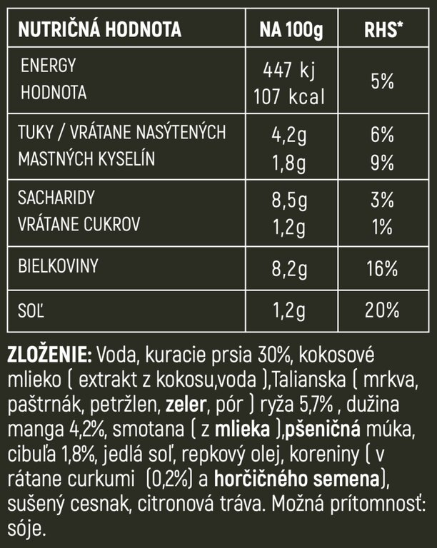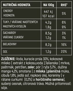 | Specificații suplimentare | Ambalaj practic cu termen de valabilitate lung. Prelucrare modernă - gust natural, păstrează vitaminele Masă completă, sățioasă și gustoasă 100 % masă și ingrediente naturale selectate 100% natural, fără conservanți Pregătire instantanee - tehnologie autoîncălzitoare Campcore® - fără foc, fără arzător, fără vase Pregătirea mâncării: rupeți siguranța ambalajului, deschideți capacul superior și scoateți acul, trageți de inel pentru a deschide capacul interior, la locurile marcate de pe marginea cutiei apăsați acele în jos până la baza orificiului, amestecați regulat, după 6 minute mâncarea va fi încălzită la o temperatură de 60 °C până la 70 °C și gata, așteptați puțin și amestecați - fiți atenți, din orificii poate ieși abur fierbinte Sure, please provide the text you want translated from Czech to Romanian. Compoziție: Apă, piept de pui (30 %), lapte de cocos (extract de cocos, apă), italiană (morcov, păstârnac, pătrunjel, țelină, praz), orez (5,7 %), mango - pulpă (4,2 %), smântână (din lapte), făină de grâu, ceapă (1,8 %), sare comestibilă, ulei de rapiță, condimente (inclusiv turmeric (0,2 %)), semințe de muștar, usturoi uscat, iarbă de lămâie |