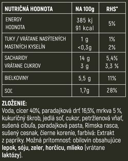 | Specificații suplimentare | Ambalaj practic cu durabilitate lungă Prelucrare modernă - gust natural, păstrează vitaminele Mâncare sățioasă și gustoasă completă 100 % ingrediente naturale selectate 100% natural, fără conservanți Potrivit pentru vegetarieni Preparare instantanee - tehnologie autoîncălzitoare Campcore® - fără foc, fără aragaz, fără vase Pregătirea mâncării: rupeți sigiliul ambalajului, deschideți capacul superior și scoateți acul, trageți de inel pentru a deschide capacul interior, în locurile marcate pe marginea conservei împingeți acele în jos până la fundul orificiului, amestecați regulat, după 6 minute mâncarea va fi încălzită la temperatura de 60 °C până la 70 °C și va fi pregătită, așteptați puțin și amestecați - fiți atenți, din orificii poate ieși abur fierbinte Of course, please provide the text you would like translated from Czech to Romanian. Compoziție: Apă, năut (40%), pulpă de roșii (16,5%), morcov (5%), amidon de porumb, sare comestibilă, zahăr, frunze de pătrunjel, ceapă uscată, pastă de roșii, chimion, usturoi uscat, piper negru, coloranți (extract de ardei). |