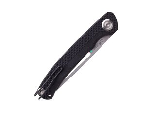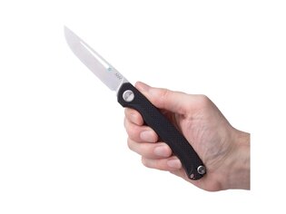 Mânerul din material G10 combină două texturi diferite. Partea superioară mai aspră de-a lungul coloanei crește siguranța prinderii, iar partea inferioară mai fină sprijină confortul în utilizarea îndelungată. Decupajul pentru degetul arătător ajută la ghidajul degetului și parțial suplineste garda. Manerul mai lung contribuie la o prindere stabilă, in ciuda greutății reduse a cuțitului.