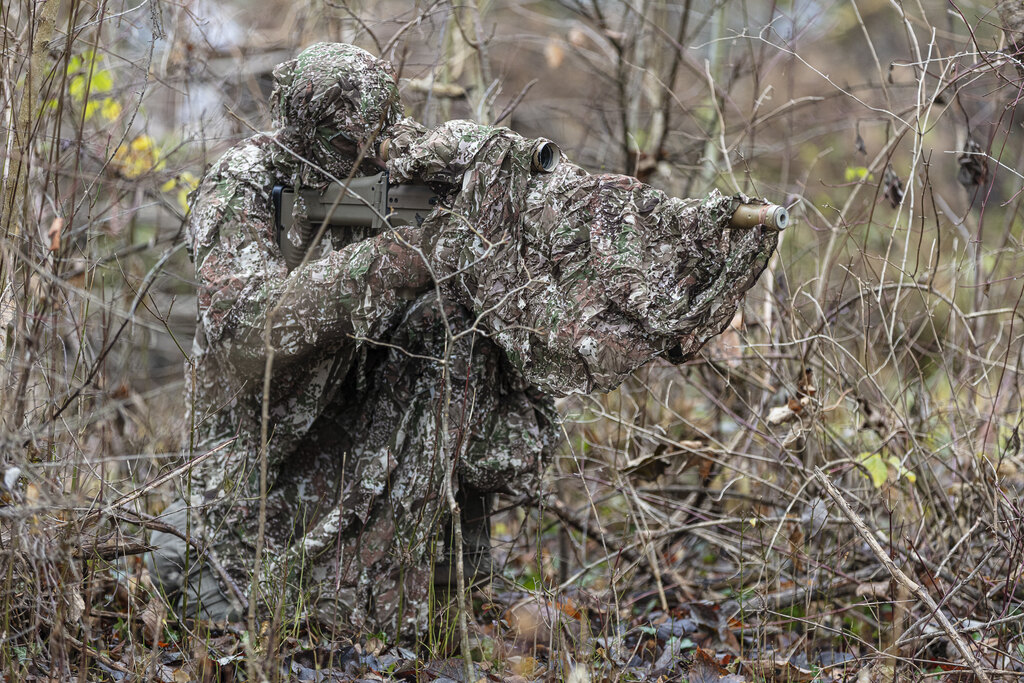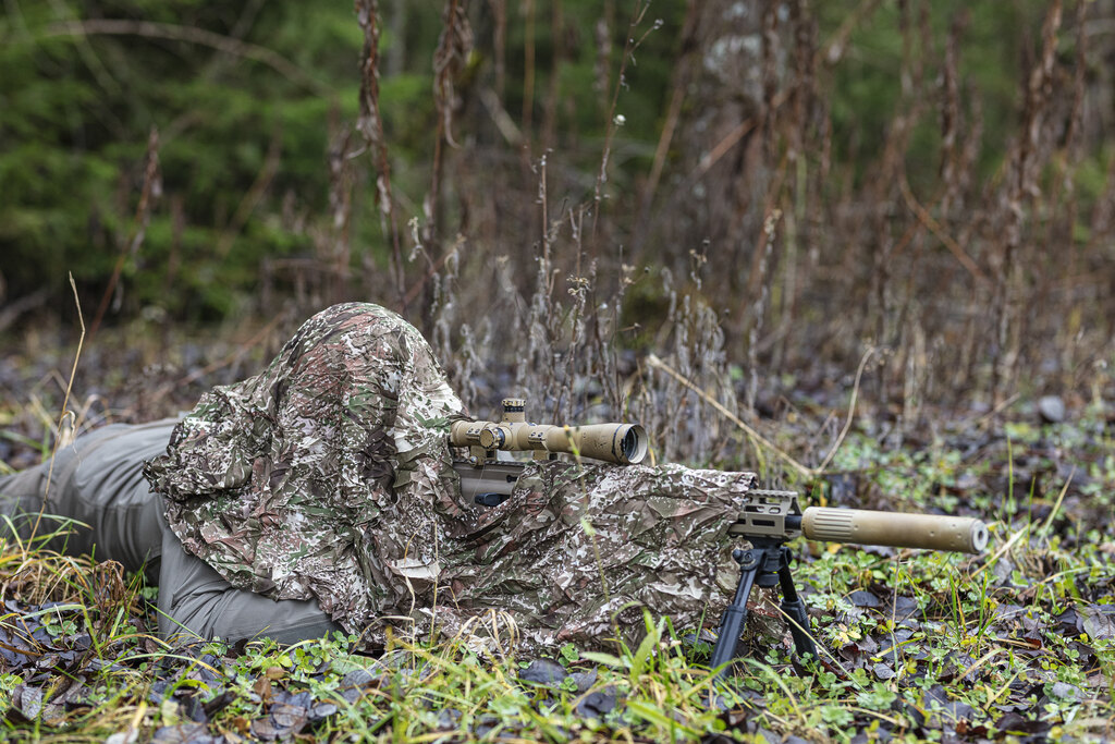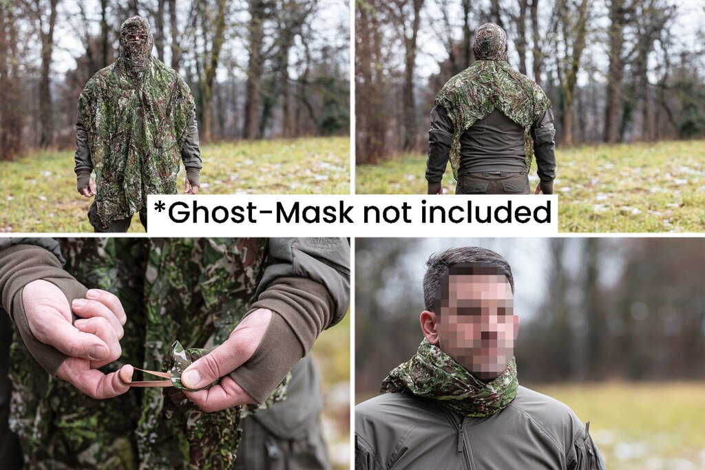 Fularul de camuflaj SNIPER VEIL este uimitor de variabil. Poate fi utilizat nu doar ca fular, ci și ca un poncho ușor sau o mică plasă de camuflaj. Deschiderea poate fi folosită și pentru optică.