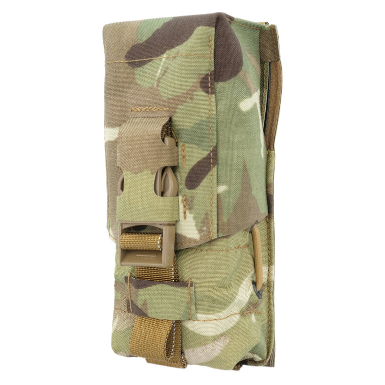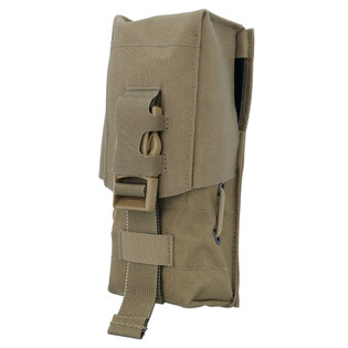 Partea din spate a pungii este echipată cu un sistem modular de fixare, astfel încât să puteți atașa punga la orice echipament compatibil MOLLE/PALS. Punga este fabricată din materiale rezistente, astfel încât să reziste și în condiții de luptă dificile. Fundul pungii este dotat cu un orificiu pentru scurgerea apei.