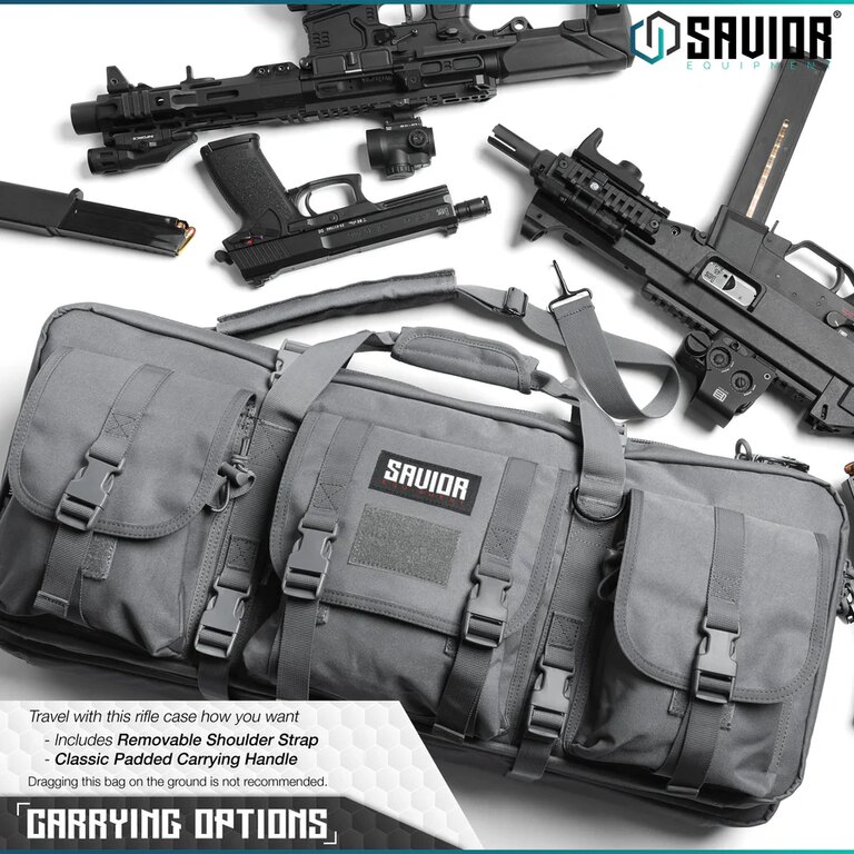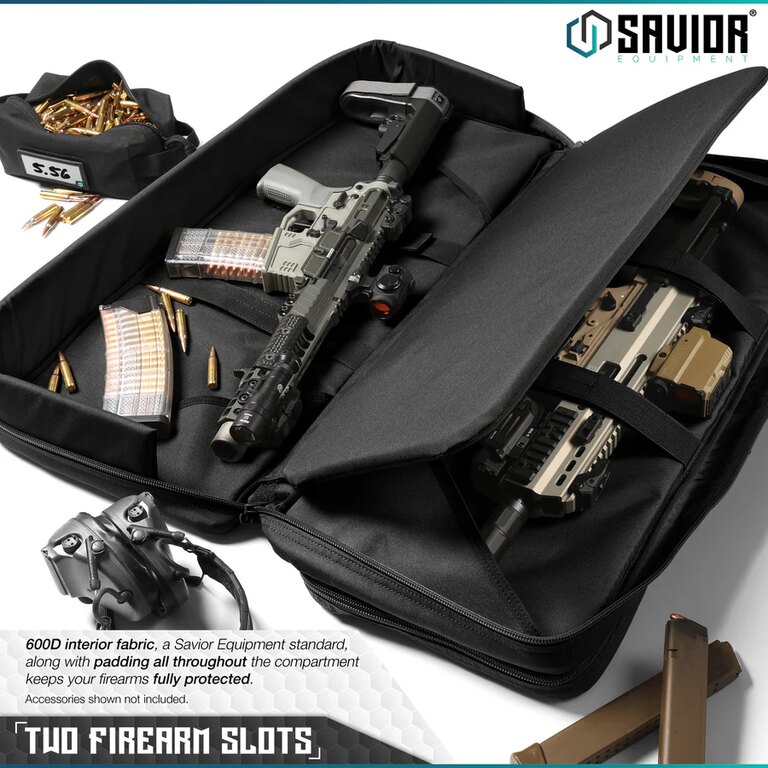 | Dimensiuni detaliate | Dimensiunile interne ale compartimentului principal: 58,4 cm × 30,5 cm × 8,9 cm Lungimea maximă a armei: 53,5 cm Compartiment secundar: 61 cm × 27,9 cm × 5,1 cm Buzunare pentru pistol: 26,7 cm × 27,9 cm Buzunare laterale exterioare: 21,6 cm × 14 cm Buzunar exterior mediu: 21,6 cm × 16,5 cm |