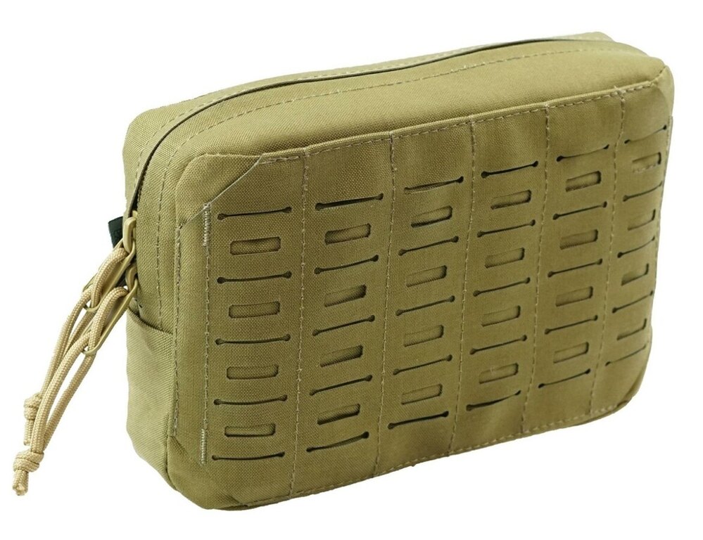 Geanta este fabricată din Cordura 500D și laminat durabil pe bază similară. Ambele materiale au protecție IRR pentru reducerea reflecției în spectrul infraroșu. Sistemul de prindere este format din patru curele care permit atașarea la orice panou MOLLE/PALS de pe o vestă tactică, rucsac sau curea. În partea de jos veți găsi orificii de drenaj pentru evacuarea apei și murdăriei.