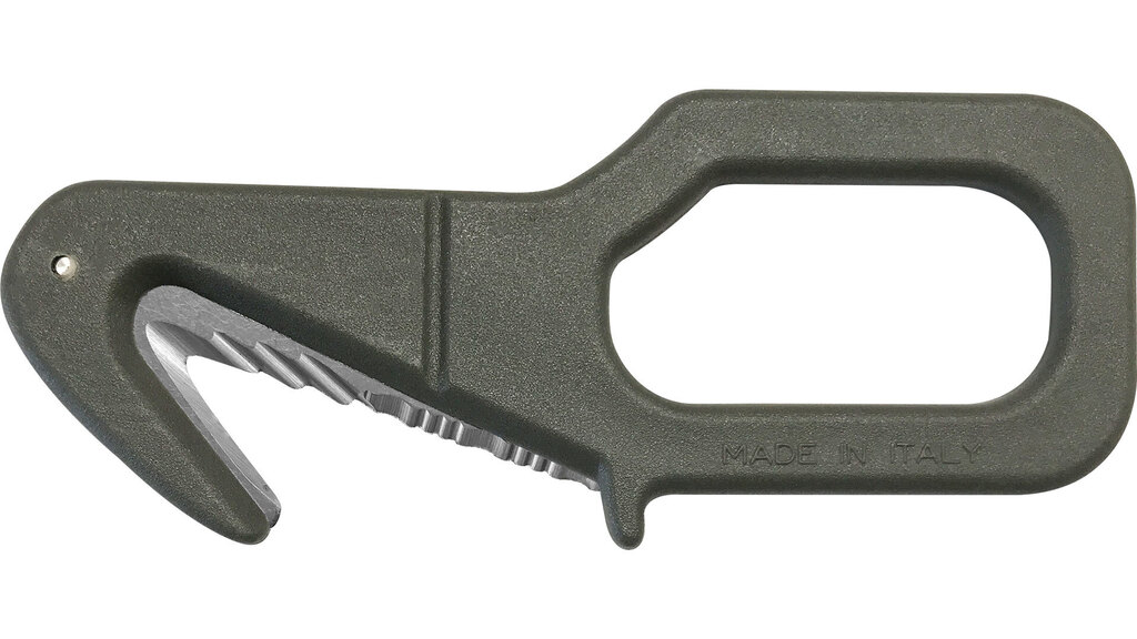 | Specificații suplimentare | Tăietor de centuri de siguranță Duritatea oțelului lamei: 54 HRC până la 56 HRC Ochi mare la capătul mânerului pe cordonul de siguranță/de fixare Clema fixă pentru buzunar sau curea pe husă (același material ca husa) Fabricat în Italia |