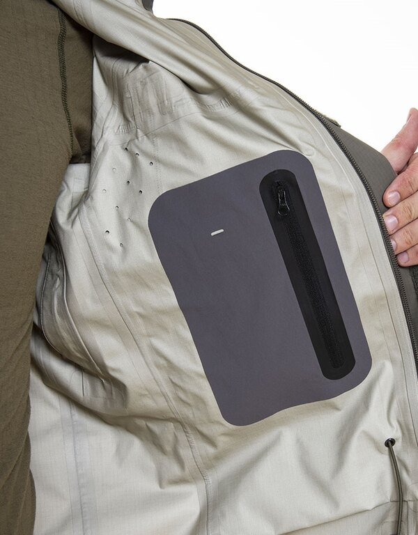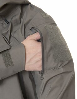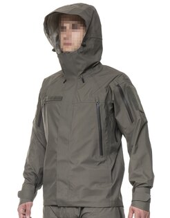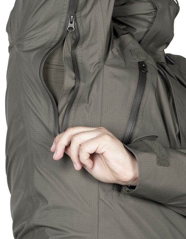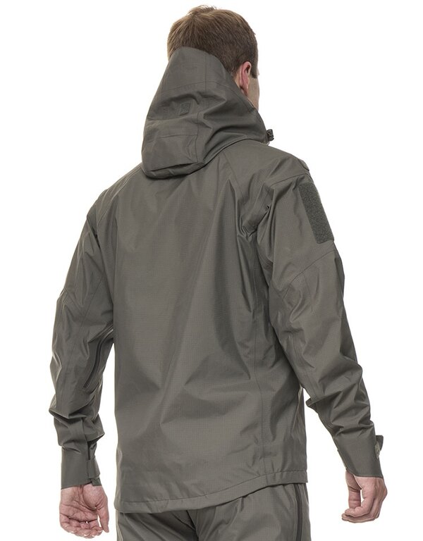 Geaca este dotată cu o glugă pe care o puteți ajusta în 3 dimensiuni în funcție de nevoile dumneavoastră. Gluga este suficient de largă pentru a se potrivi confortabil chiar și atunci când purtați o cască. Toate cusăturile sunt lipite, asigurând astfel o impermeabilitate maximă. Datorită croielii confortabile, geaca este comodă chiar și în cazul unui purtat pe tot parcursul zilei. Pe umeri și pe partea frontală a gecii veți găsi panouri VELCRO pentru atașarea unei etichete cu nume, locul de origine, grupa sanguină etc. Geaca se închide cu un fermoar acoperit de o clapetă.