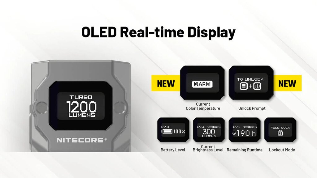 Afișajul OLED integrat arată toate informațiile esențiale în timp real – de la modul selectat, starea bateriei până la estimarea duratei de funcționare. Nitecore TUP2 elimină astfel incertitudinea și permite o reacție rapidă la condițiile în schimbare. Afișajul simplifică controlul și adaugă îndrumare, asigurând că lanterna funcționează exact cum trebuie.