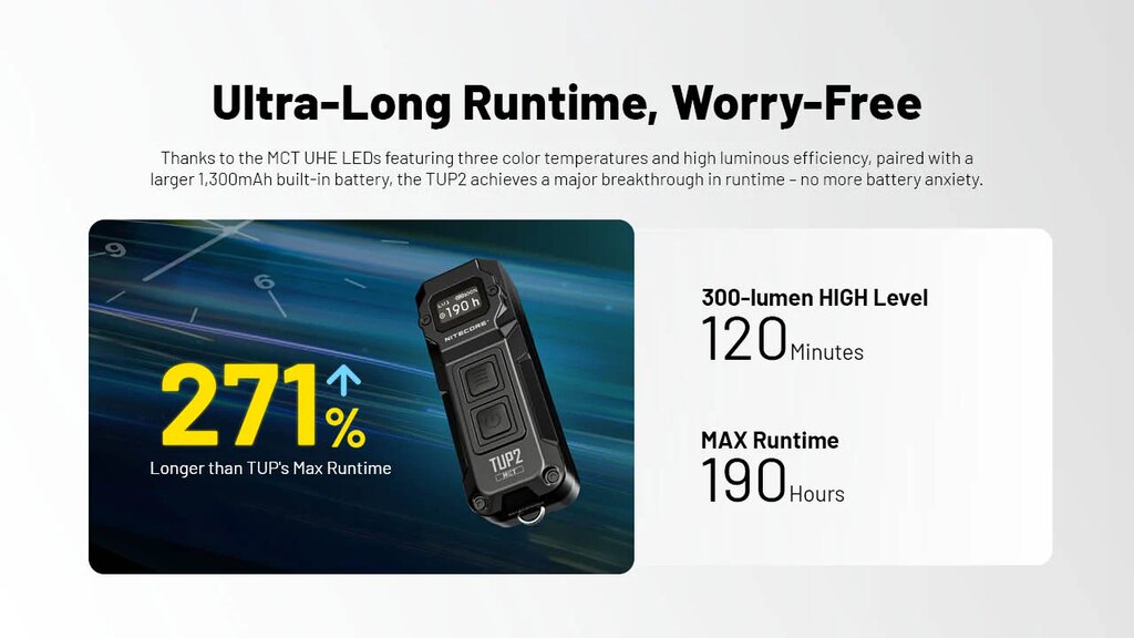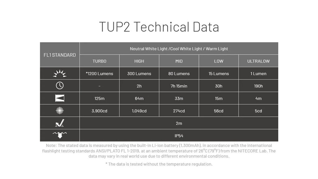 Nitecore TUP2 oferă o gamă largă de luminozități, de la lumină subtilă pentru orientare până la un flash extrem de puternic. Datorită gestionării eficiente a puterii, gestionează ore îndelungate de funcționare și menține o lumină stabilă pe tot parcursul. Doar alege modul și lumina se va ocupa de restul.