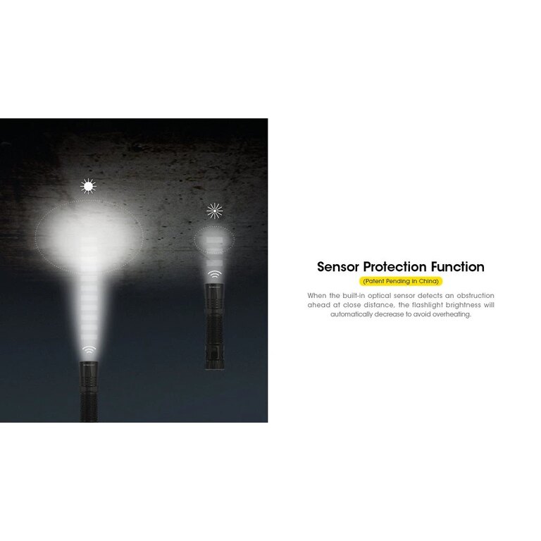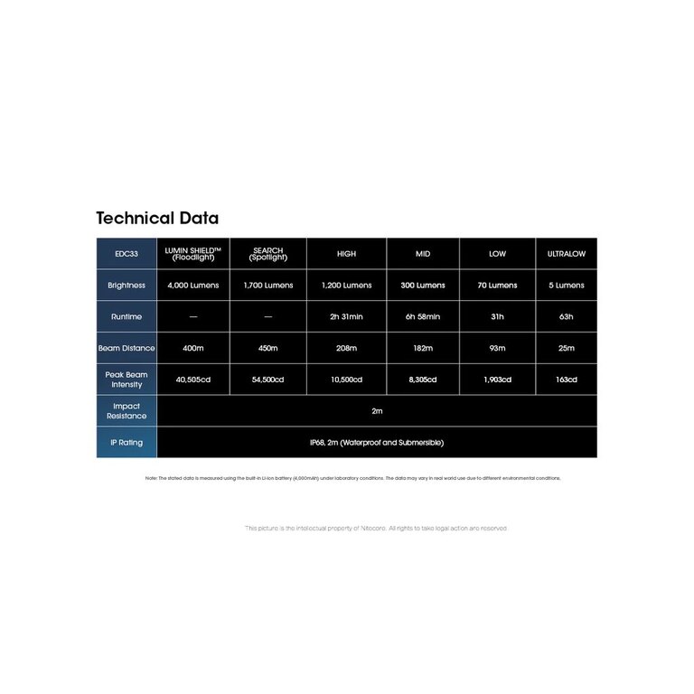 Measured according to the ANSI FL 1 standard under laboratory conditions, using an integrated rechargeable Li-ion 18650 battery (4,000 mAh), at a specific temperature and humidity. Values may vary depending on ambient conditions or flashlight usage (using a different power source is not possible).