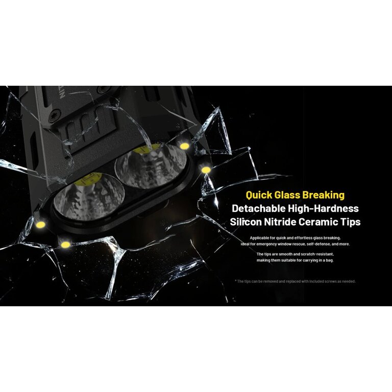 Dotările includ vârfuri ceramice capabile să spargă instantaneu sticla, precum și o curea și un cablu de încărcare în pachet. Dimensiunile mici și greutatea sub 200 de grame o fac un partener de încredere atât în serviciu cât și la expedițiile în natură.