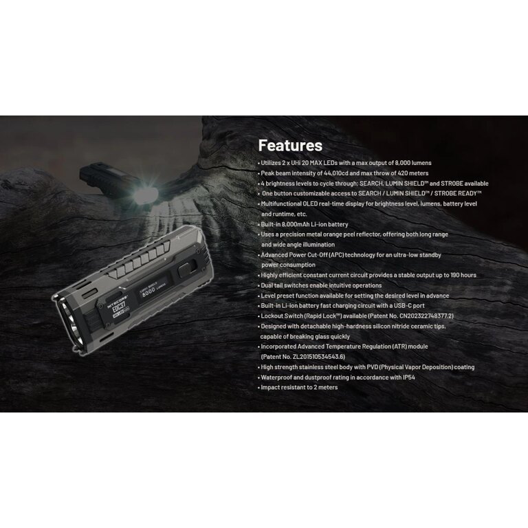 | Specificații suplimentare | Nava amiral Nitecore® pentru anul 2025 Număr LED-uri: 2 albe Tip LED: 2× Dual NiteLab® UHi 20® Max - 2× UHi 20® + 2× 8 nuclee auxiliare (UHi 20® - LED special dezvoltată pentru noua eră, în comparație cu LED-urile disponibile obișnuit sunt cu aproximativ 41% mai mici (2,26 mm²) și au o densitate luminoasă cu aproximativ 43% mai mare (876 lm / mm²)) Reflector metalic texturat precis (reflector de coajă de portocală) oferă o rază lungă și iluminare cu unghi larg. Conul de lumină: fascicul punctiform/îngust (miez LED primar) și dispersie (miezuri LED auxiliare) Sure, please provide the text you would like translated from Czech to Romanian. Control: 2 butoane tactice la capătul lanternei Moduri disponibile: lumină albă de intensități diferite - 4 + 3 moduri speciale - stroboscop tactic, Search și Lumin Shield™ Lumin Shield™ - creează un zid de lumină asemănător unui scut pentru o apărare personală foarte eficientă Stroboscop de a 2-a generație - pornire/oprire cu o mână, alternarea aleatorie a frecvenței în intervalul de la 16 Hz la 20 Hz - efect orbitor mai puternic Opțiunea de presetare a nivelului de performanță Încărcare rapidă prin portul de tip UB-C direct pe lanternă Încărcare rapidă inteligentă cu o putere de 18 W, încărcare completă în 2 h, utilizați un încărcător sau un powerbank care acceptă protocoalele de încărcare rapidă PD/QC. Afișajul OLED arată în timp real modul selectat, timpul de iluminare rămas pentru modul respectiv, modul de blocare, starea bateriei și indicatorul de încărcare. Funcția de blocare în 2 moduri: modul 1 - blocat doar butonul On / Off (butonul Tactical rămâne disponibil pentru acces rapid la modurile Lumin Shield™, Search și Stroboscop) și modul 2 - ambele butoane blocate (ideal pentru transportul lanternei). Rapid Lock™ - blocare rapidă a lanternei folosind cursorul lateral (brevet nr. CN202322748377.2) Clip pentru purtarea în buzunar sau pe curea, posibilitatea de atașare a unei șnur de siguranță (inclus în livrare) Suprafață antiderapantă unică (în curs de brevetare în UE și SUA, brevet nr. CN2024206649950) pentru o prindere sigură și fermă cu mâna goală sau cu mănuși Vârfuri ceramice foarte dure pentru spargerea geamului în față Of course! Please provide the text you'd like translated from Czech to Romanian. Un circuit de înaltă eficiență cu curent constant oferă performanță stabilă. Tehnologia APC (Advanced Power Cut-Off) pentru un consum extrem de redus de energie în modul de așteptare Reglare avansată a temperaturii - ATR (Advanced Temperature Regulation) (patent nr. ZL201510534543.6) Un nou sistem de grilaj pentru disiparea căldurii echilibrează aspectul plăcut și utilizarea practică - oferă o disipare a căldurii eficientă și extensivă, menține performanțe ridicate fără supraîncălzire și o utilizare confortabilă în mână. Of course, please provide the text you would like to have translated from Czech to Romanian. Durata maximă de funcționare: 190 h Luminozitate maximă: 44 010 cd Acoperire: IP54 (protecție împotriva prafului depozitat, rezistă la ploaie obișnuită) Rezistență la impact: până la 2 m |