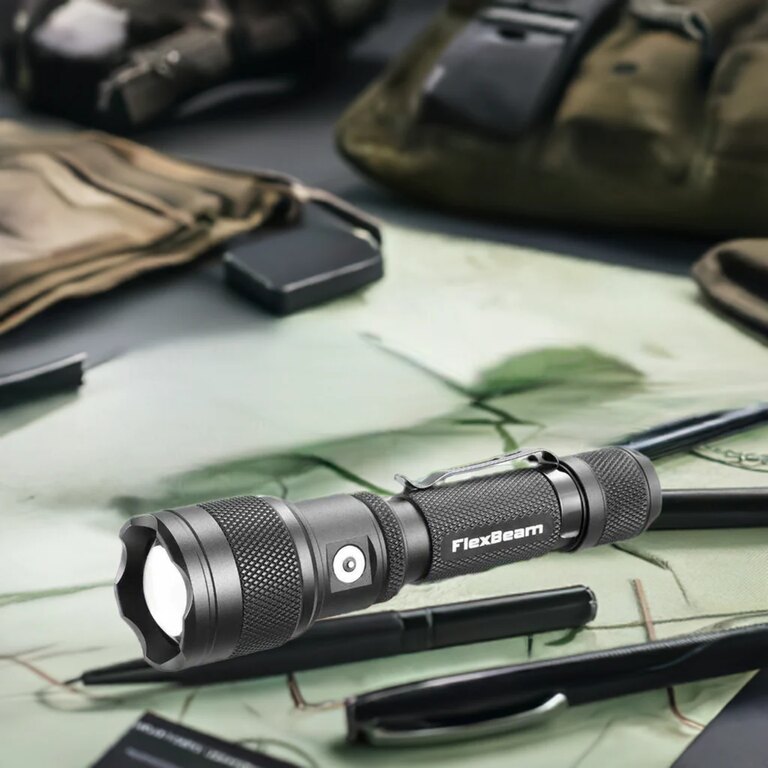 FlexBeam are un clip din oțel reversibil pentru transportul ușor în buzunar sau pe echipament. Datorită capului plat, poate sta „la lumânare” și poate servi ca iluminare statică. Setul include un cablu de încărcare, acumulator, toc pentru curea și etanșări de rezervă – tot ceea ce este necesar imediat după despachetare.
