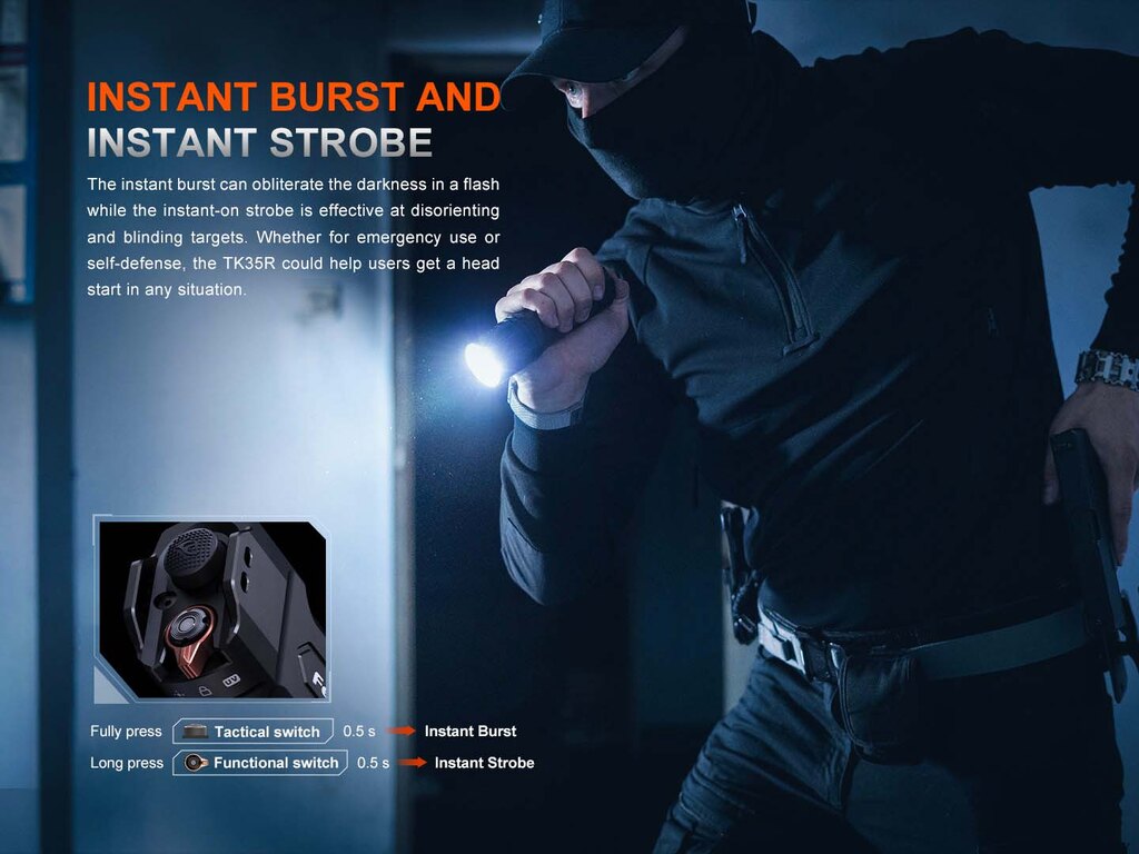 Comutatorul tactic de la capăt asigură o reacție imediată și o utilizare rapidă a stroboscopului. Butonul auxiliar este utilizat pentru a comuta între nivelurile de performanță. TK35R memorează ultimul mod setat și, la fiecare pornire, continuă de unde a rămas. De asemenea, indicarea stării bateriei arată imediat după pornire nivelul de energie rămasă.
