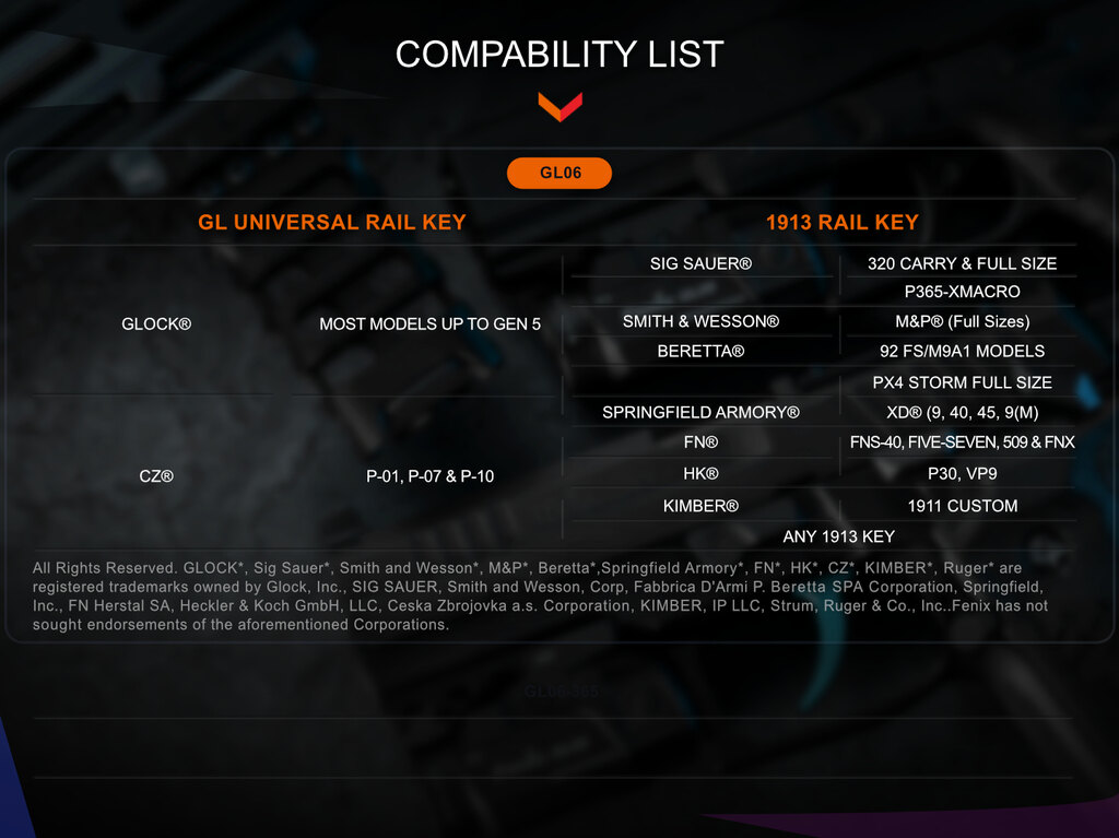 GL06 se potrivește pe șinele standardului Picatinny MIL-STD-1913 și pe pistoalele Glock, ceea ce facilitează montarea pe majoritatea armelor de serviciu și de autoapărare. Datorită corpului compact, nu adaugă volum inutil și rămâne stabil chiar și în timpul manipulării energice. Construcția rezistă utilizării zilnice, scoaterii frecvente din toc și reculului.
