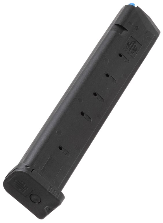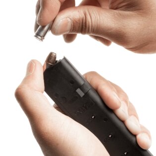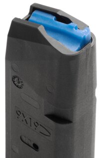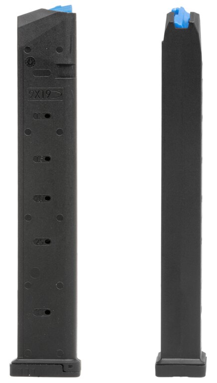 Încărcătorul este echipat cu un dispozitiv de alimentare albastru cu vizibilitate ridicată și un arc din inox cu durată lungă de viață, asigurând alimentarea fiabilă a cartușelor și minimizând riscul de blocare. Indicatorii gravați la 10, 15, 20, 25 și 33 de cartușe permit o verificare rapidă și precisă a stării muniției.