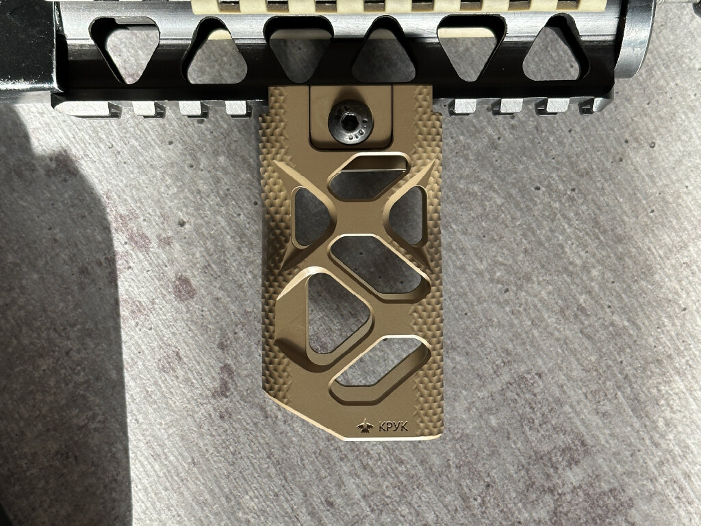 Când trebuie să fie fix, alegeți Picatinny. Mânerul frontal Medium Picatinny Kpyk este un mâner de lungime medie, fiabil, cu prindere sigură, prelucrare precisă și construcție robustă. Montajul pe șină se menține, forma se potrivește în mână și Cerakote nu se teme de utilizarea mai dură.