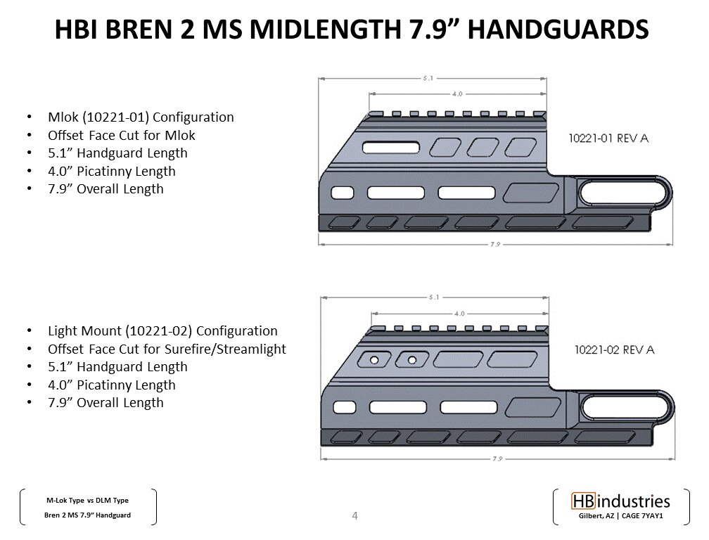 Manșonul HB Industries pentru Bren 2 oferă, în comparație cu manșonul de fabrică pentru pușca Bren 2 Ms, o suprafață semnificativ mai mare, un suport fiabil pentru mâini și mai multe sloturi M-LOK.
