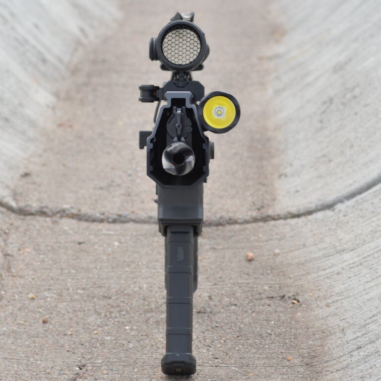 Manșonul are sloturi Magpul M-LOK pe pozițiile 3, 6 și 9 ore, iar în partea frontală superioară dispune de un slot suplimentar M-LOK pe pozițiile 3 și 9 ore. Această poziție este ideală pentru montarea unei lanterne. Pe ora 12, manșonul are o șină Picatinny pe toată lungimea sa.