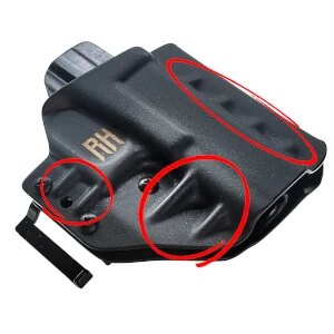 Tocurile RH Holsters OWB Frogy sunt fabricate din kydex de 2,5mm, ceea ce crește rezistența și durabilitatea lor, la fel ca nervurile. Materialul unui singur toc are, în plus, o culoare uniformă și forma tocului este presată în kydex folosind matrițe speciale de producție proprie.