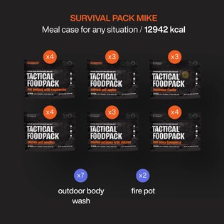 Survival Pack Mike este conceput pentru condiții dure, unde nutriția și igiena de încredere sunt esențiale. Conține 21 de porții de mese nutritive cu o valoare energetică totală de 12.942 kcal, asigurând suficientă energie pentru o perioadă de șapte zile. Pachetul include și 7 dușuri de unică folosință pentru igiena de bază și 2 încălzitoare Fire Pot pentru încălzirea ușoară a meselor fără a fi nevoie de foc deschis.