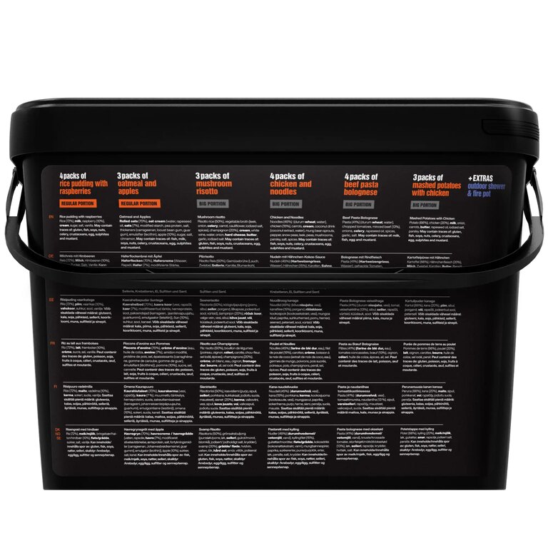 | Con?inutul pachetului | Baleno într-un recipient etanș la apă În total 21 feluri de mâncare 4× Budincă de orez cu zmeură 3× Terci de ovăz cu mere 3× Risotto cu ciuperci 4× Pui cu tăiței 3× Piure de cartofi cu carne de pui 4× Paste Bolognese cu carne de vită 2× încălzitor de mâncare (Tactical Fire Pot) 7× duș de exterior de unică folosință |