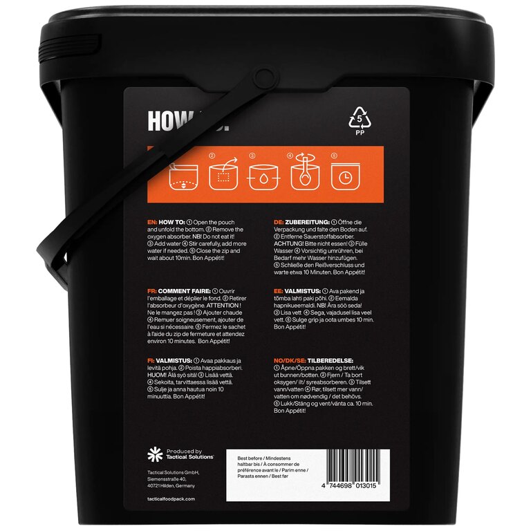 | Alte specifica?ii | Ambalaj mare - mai ieftin decât să cumperi fiecare masă separat Alimente liofilizate cu conținut ridicat de energie fără OMG Fără ulei de palmier și amidon Preparat din ingrediente naturale, fără conservanți Fără "chimie" și aditivi nenecesari Adevăratul gust Durată lungă de viață la depozitare - până la 8 ani de la data fabricației Temperatura de depozitare: 10 °C până la 30 °C Fabricat în Germania Aprobat și verificat de NATO Număr de stoc NATO (NSN): 8970-38-001-5443 Fiecare mâncare este ambalată într-un ambalaj resigilabil. Preparare ușoară - deschideți pachetul, turnați apă fierbinte, amestecați și închideți din nou Înainte de a turna apă, îndepărtați absorbantul de oxigen! Cantitatea necesară de apă indicată pe pachet (de la 150 ml) Timpul de așteptare după turnare: indicat pe pachet (5 min până la 10 min) Posibilitatea de a pregăti și cu apă rece (așteptare mai lungă, mâncare rece) |
