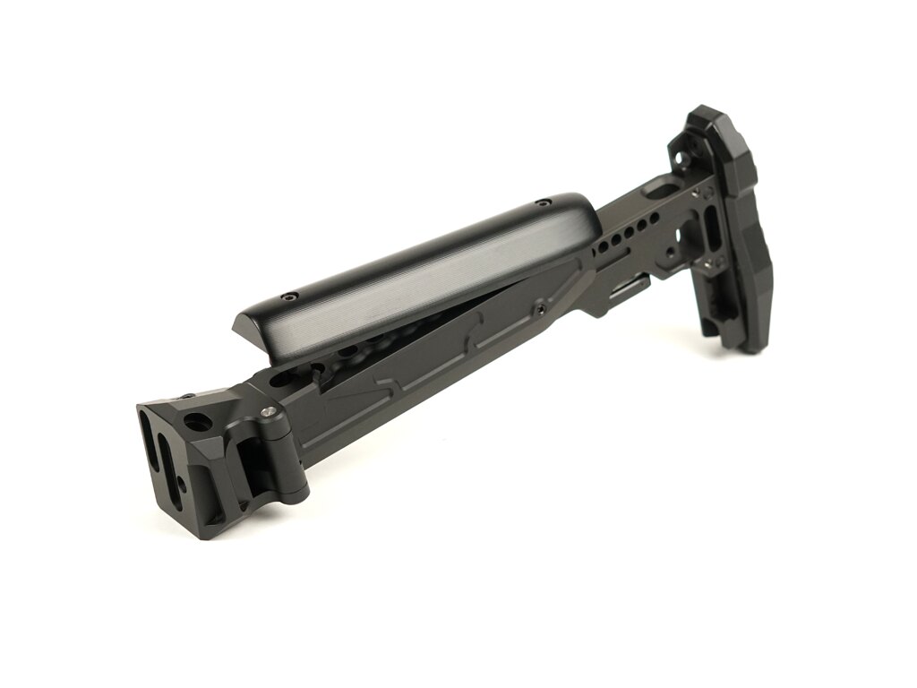 Corpul este realizat din aluminiu frezat 7075 – fără turnări sau compromisuri. Creștetul din poliamidă este reglabil pe înălțime, iar împreună cu botul reglabil și posibilitatea de a regla lungimea patului, oferă o bază ideală pentru o tragere precisă și confortabilă. Piesele solide sunt frezate din masiv și ansamblul se simte robust de la primul contact.