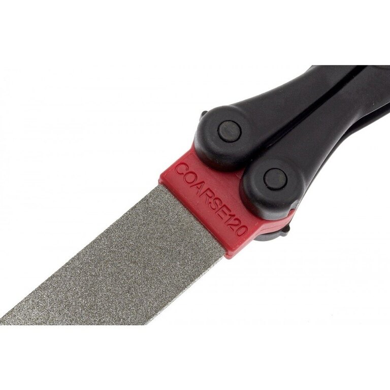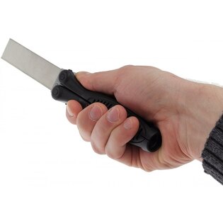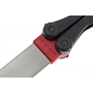 Piatra de șlefuit se pliază simplu într-un mâner ergonomic din nylon, care o protejează și facilitează transportul. Piatra cu suprafață de diamant este cu două fețe, pe o parte are o granulație grosieră de 120 și pe cealaltă parte o granulație medie de 600. Piatra de ascuțire ascute marginile drepte ale cuțitelor și multe alte unelte. Diamantul este cunoscut ca fiind cel mai dur mineral și de aceea este abrazivul ideal pentru reîmprospătarea și întreținerea rapidă a tuturor uneltelor și cuțitelor. Diamond Paddle este astfel ideal pentru orice atelier. Și nu doar acolo - tocmai ați găsit o modalitate de a ascuți ușor oriunde cuțitul sau altă unealtă, de exemplu o secure. Nu vreți să transportați peste tot o trusă de ascuțire? Această piatră de ascuțire pliabilă face treaba diferitelor truse de ascuțire și datorită dimensiunilor mici și greutății reduse, nici nu o veți simți în buzunar sau altundeva.