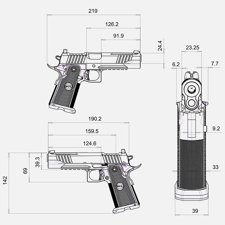 Pistolul BUL SAS II TAC 5" are o țeavă de lungime completă. Astfel, are o țeavă de 5 inch și un modul polimeric al mânerului de dimensiuni mari. Mânerul este suficient de ergonomic pentru a fi confortabil și precis.