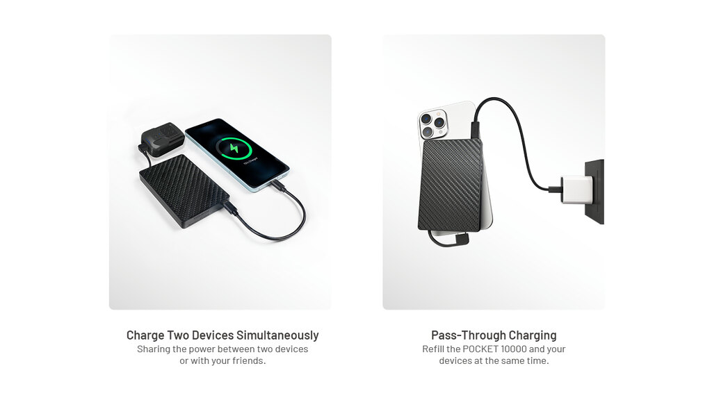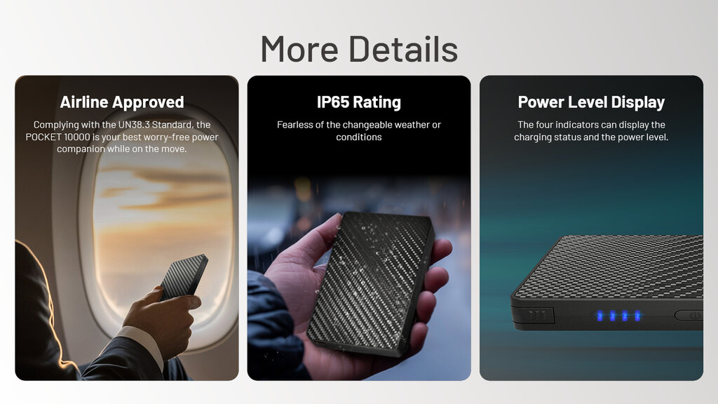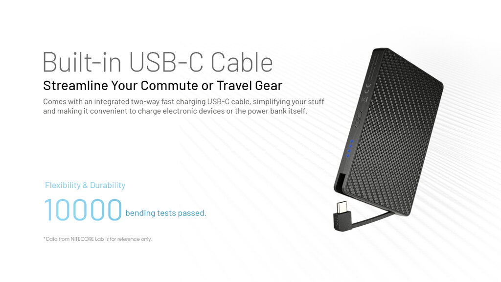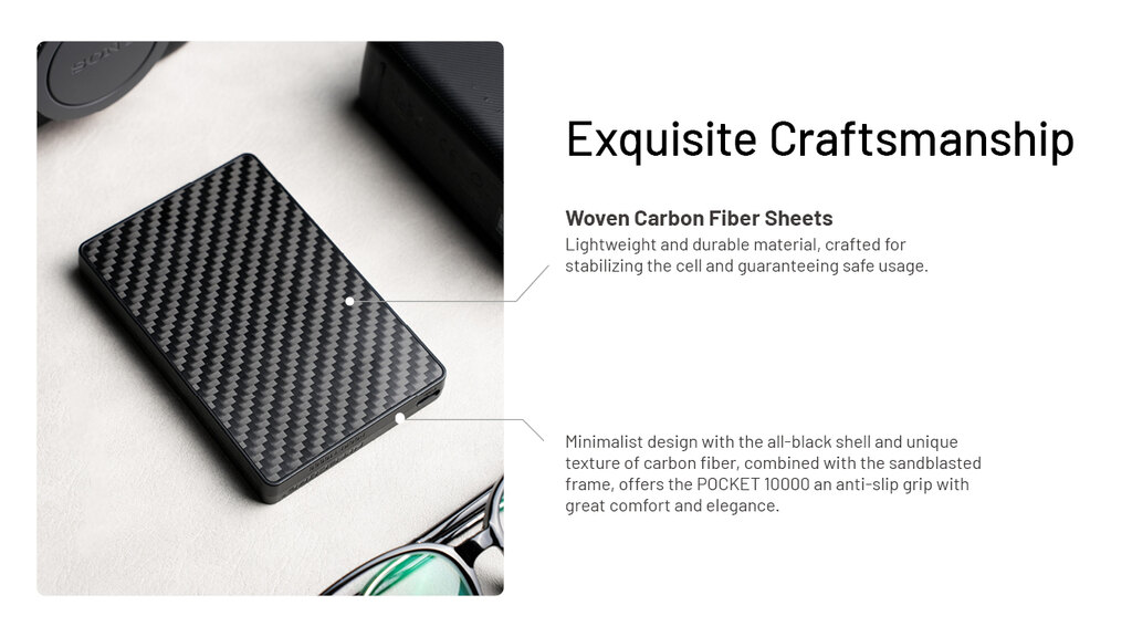 Nitecore Pocket 10000 este subțire, durabilă și pregătită pentru orice. Îți încarcă telefonul, camera foto și alte echipamente mai repede decât ai zice pește. Datorită corpului din carbon, cablului USB-C încorporat și greutății de doar 160 de grame, se potrivește atât în buzunar, cât și într-o viață activă.