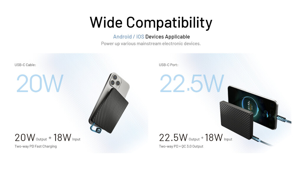Chiar dacă cântărește doar 160 de grame, poate încărca un smartphone modern de mai multe ori. Dimensiunile compacte de 105 × 70 × 12,5 mm o fac partenerul ideal pentru călătorii – fie în buzunar, rucsac sau organizatorul din echipament.