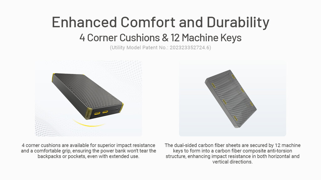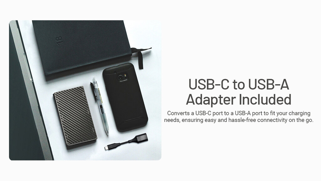 Două porturi USB-C pot încărca două dispozitive simultan și, datorită protocoalelor QC, PD, FCP și SCP, identifică ceea ce este conectat. Permite încărcarea pasantă – astfel încât își reîncarcă energia atât pe sine, cât și pe dispozitivele conectate. În pachet se află un adaptor USB-C → USB-A pentru cablurile mai vechi.
