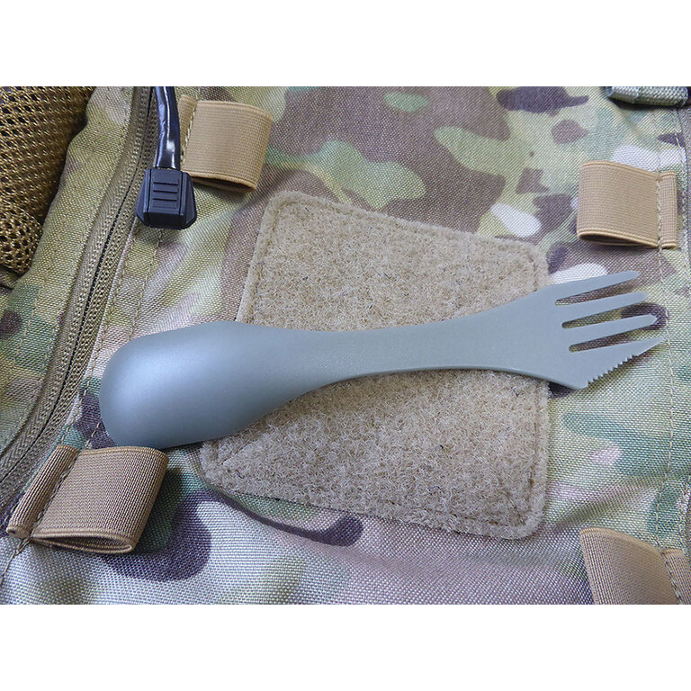 La prima vedere este evident că compania JTG (Jackets to go) din Berlin nu se bazează doar pe designul atemporal al acestui instrument de masă, ci îi păstrează și funcționalitatea perfectă în formatul 3 în 1. Tacâmul este fabricat dintr-un plastic durabil, sigur pentru sănătate. Combină lingura, furculița și o margine scurtă zimțată, cu care puteți tăia mâncarea asemănător cu un cuțit. Datorită dimensiunilor compacte, Spork poate fi purtat în buzunar sau în capacul rucsacului, fie că sunteți în excursie, misiune de luptă sau în vacanță. Veți avea mereu la îndemână un instrument cu care să consumați orice aliment indiferent de consistență sau temperatură.