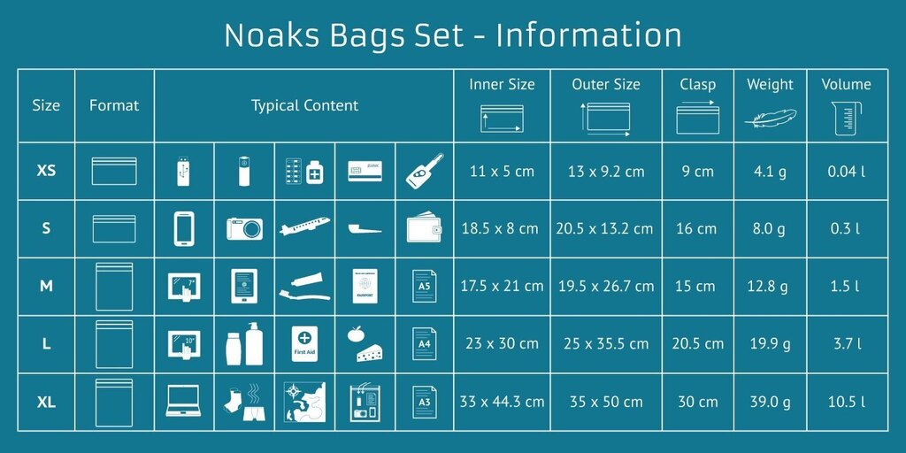 Protejați-vă valorile în situații neplăcute precum ploile torențiale sau scufundările neașteptate în apă. În aceste pungi, puteți păstra telefonul mobil, documentele, electronicele, portofelul și altele asemenea. Adică acele obiecte care trebuie să rămână uscate cu orice preț. Pungile au un nivel de impermeabilitate IPX 8. Ce înseamnă asta? Vă puteți scufunda cu ele fără probleme până la o adâncime de zece metri timp de două ore. Datorită utilizării materialelor de înaltă calitate, sunt, de asemenea, foarte rezistente. Sunt și sigure pentru sănătate, astfel încât puteți păstra și mâncarea în ele. Setul include câte o pungă de dimensiuni XS, S, M, L și XL.