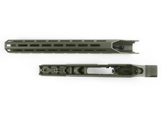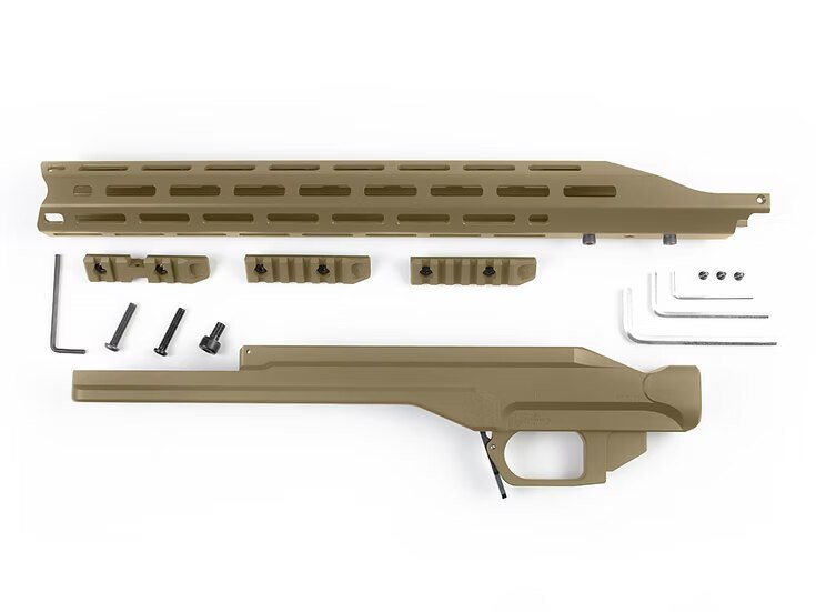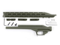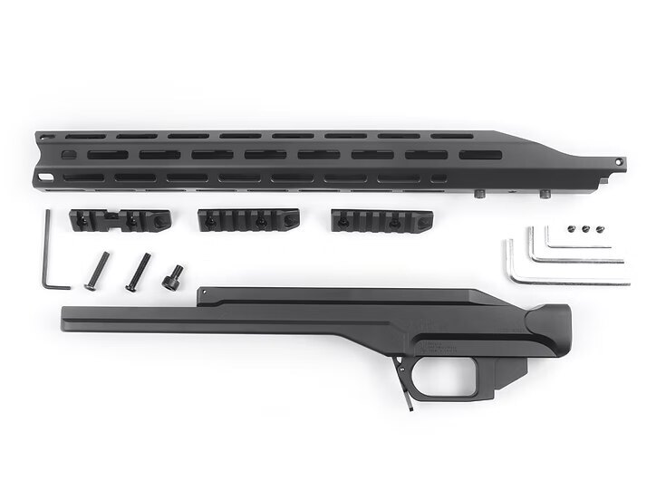 | Parte a livrării | 1× șasiu din aluminiu (7075) 1× uluc (aluminiu 6082) cu sloturi M-LOK 1× adaptor bipod CRC 9029 (Harris) cu montură M-LOK 2× șină Picatinny 80 mm cu montare M-LOK Set de șuruburi de montaj |