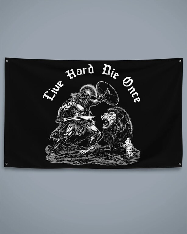 Citat din Caesar, motivul lui Leonidas – și o idee care nu îmbătrânește. Această vlagă poartă un mesaj pentru cei care știu că onoarea și curajul nu sunt doar cuvinte. Fiecare detaliu amintește că omul curajos moare doar o dată, în timp ce lașul moare puțin câte puțin întreaga viață.