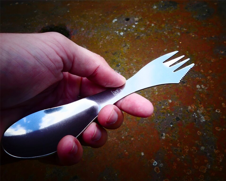 De ce să iei toate cele 3 tacâmuri cu tine când călătorești, când poți lua doar unul? Survival Spork – 5ive Star Gear combină lingura, furculița și cuțitul într-un singur obiect. Datorită faptului că această „furculiță” este fabricată din oțel, te poți baza pe faptul că va dura foarte mult timp. În plus, poate fi spălată în mașina de spălat vase.