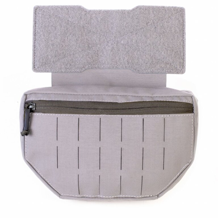 Datorită sistemului de prindere, această husă se atașează ușor cu ajutorul velcro sub platforma frontală a plăcii de protecție sau a vestei balistice. Astfel, obțineți spațiu suplimentar, fără a ocupa alt loc pe platformă sau în altă parte a vestei. Închiderea husei este realizată cu un fermoar YKK de calitate, care poate fi manipulat chiar și cu mănuși datorită tragerii prelungite a cursorului. În interiorul buzunarului veți găsi două curele elastice cusute care servesc la fixarea echipamentului și un compartiment cu plasă cu velcro. Partea frontală a husăi este dotată cu un sistem MOLLE tăiat cu laser pentru a atașa echipamente suplimentare, precum turnichete, luminari etc. Materialul are o finisare IRR pentru a reduce reflexia în spectrul infraroșu.