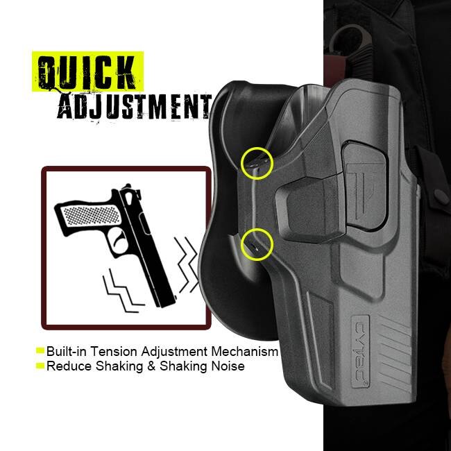 | Alte specifica?ii | Compatibil cu pistolul echipat cu o lunetă cu punct roșu Purtați confortabil Eliberator pentru degetul arătător Control perfect, purtare sigură și acces rapid la armă (scoatere și depozitare rapidă a armei). Noul mecanism de ajustare a retenției |