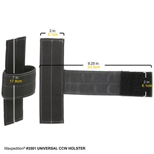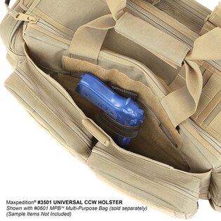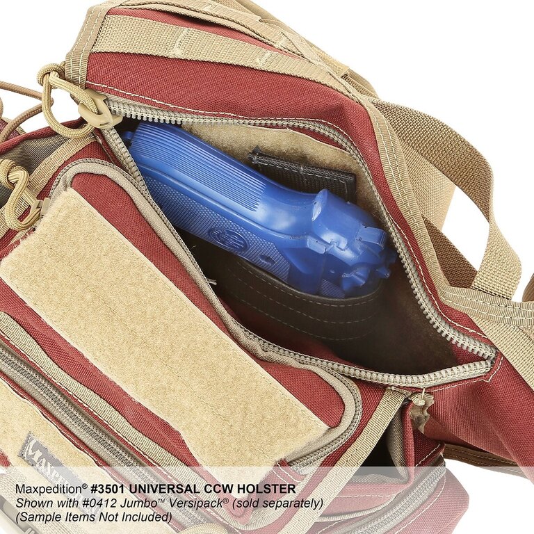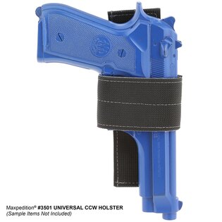 Husă universală pentru purtarea ascunsă a pistolului (CCW = arma ascunsă). Husa este destinată atât pentru dreptaci cât și pentru stângaci și poate găzdui majoritatea pistoalelor. Cureaua de retenție poate fi ajustată cu ajutorul velcro-ului astfel încât să se potrivească perfect cu pistolul. Se fixează cu ajutorul velcro pe partea din spate la panourile velcro plasate în exteriorul sau în interiorul rucsacurilor, genților, organizatoarelor etc.