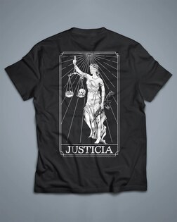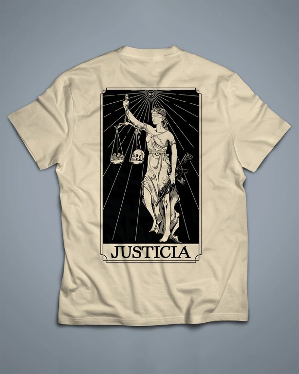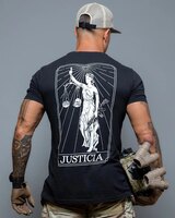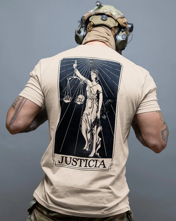 Justicia – zeița romană a justiției – a devenit un simbol al responsabilității, moralei și echilibrului. Designul tricoului aduce imaginea ei pe câmpul de luptă modern. Acolo unde soldatul ține arma și stă în praf și noroi. Este un omagiu tăcut adus celor care iau decizii dificile sub presiune și cu cunoștința consecințelor.
