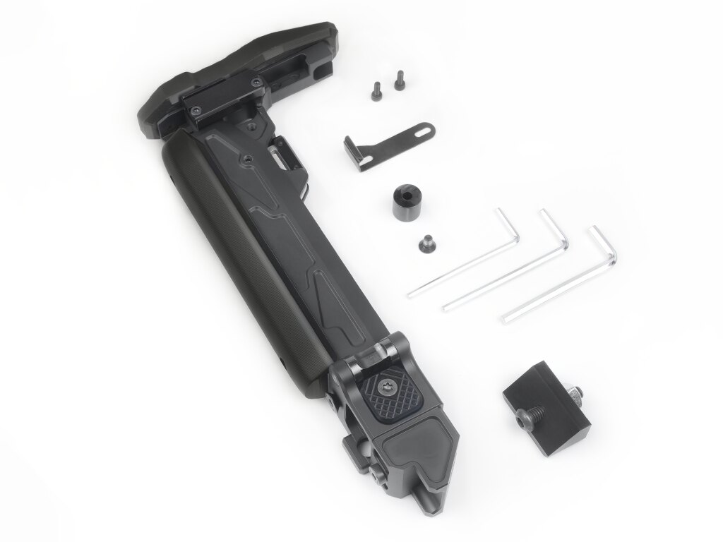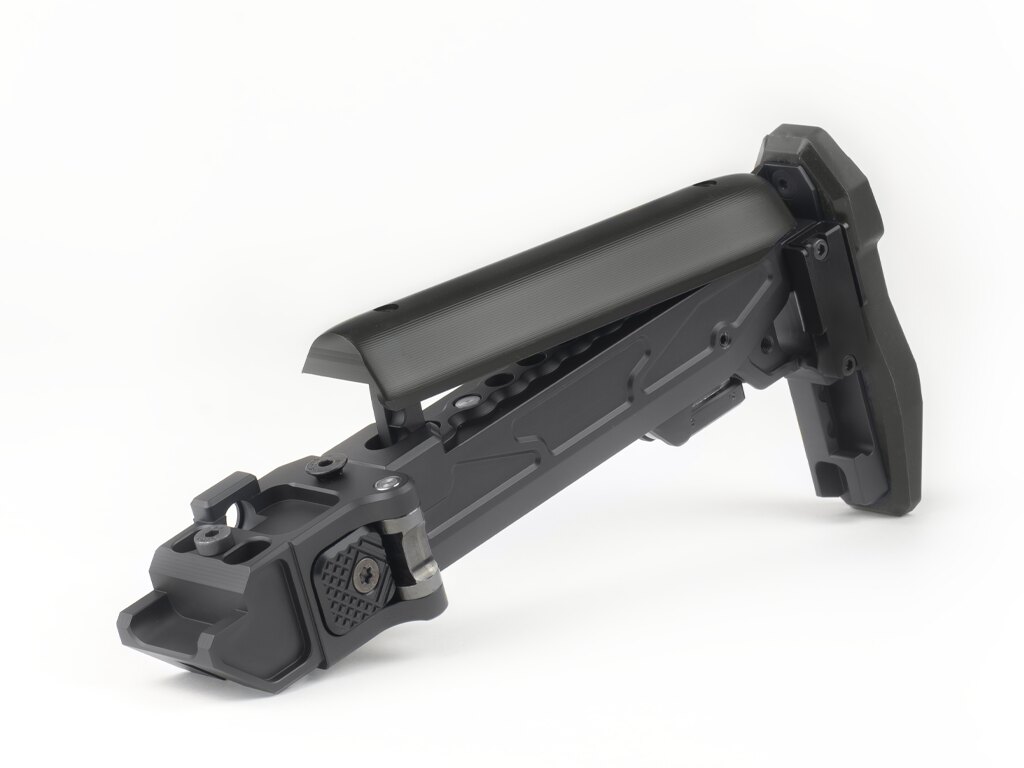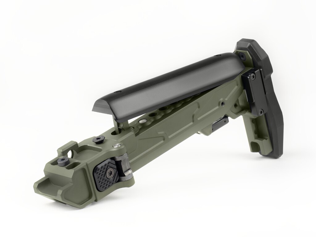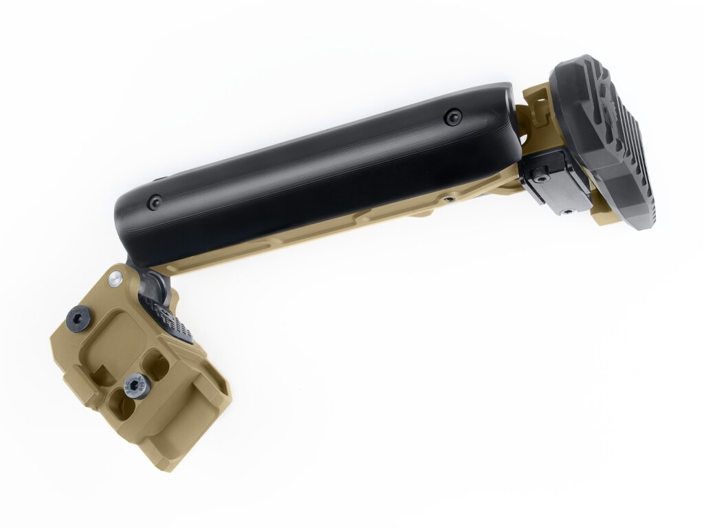 În poziția pliată, patul este ținut fie printr-un bloc magnetic, fie printr-o clemă reglabilă pe înălțime – ambele proiectate astfel încât patul să rămână pliat atunci când este nevoie. Suporturile integrate pentru curea și sloturile QD asigură opțiuni variabile de purtare în funcție de situație.
