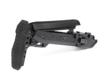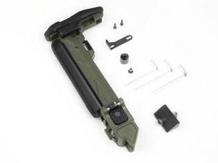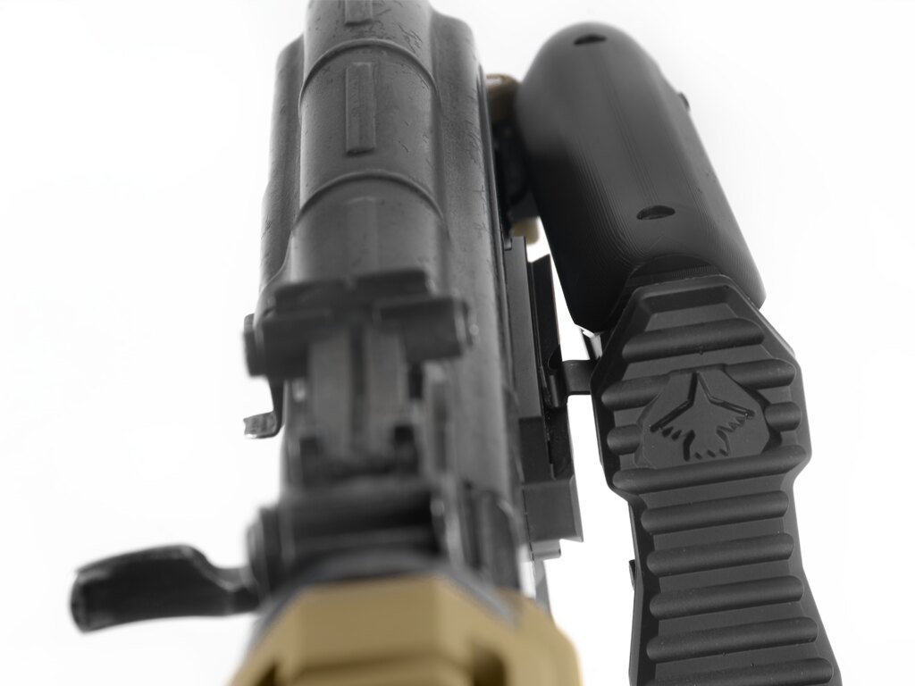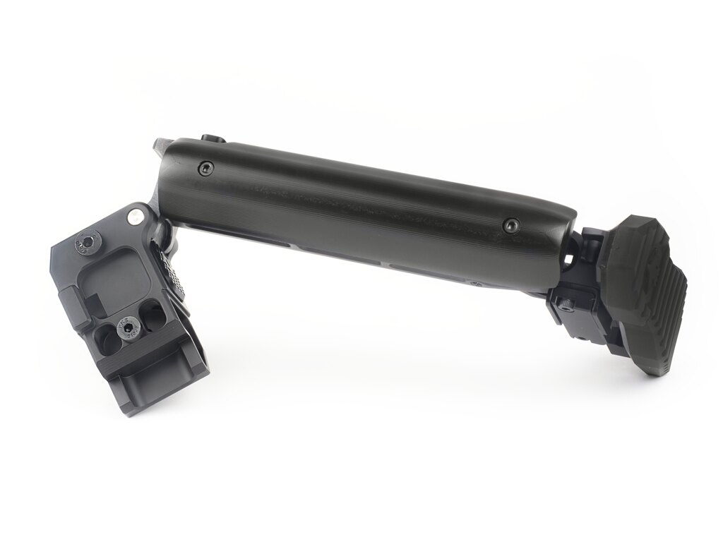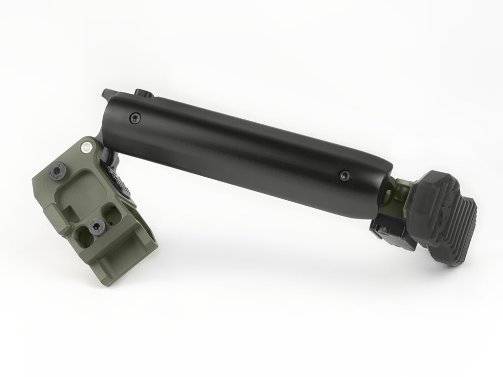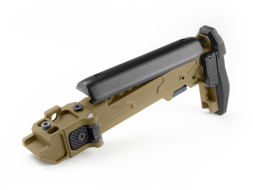 În poziția pliată, patul este ținut fie printr-un bloc magnetic, fie printr-o clemă reglabilă pe înălțime – ambele proiectate astfel încât patul să rămână pliat atunci când este nevoie. Suporturile integrate pentru curea și sloturile QD asigură opțiuni variabile de purtare în funcție de situație.